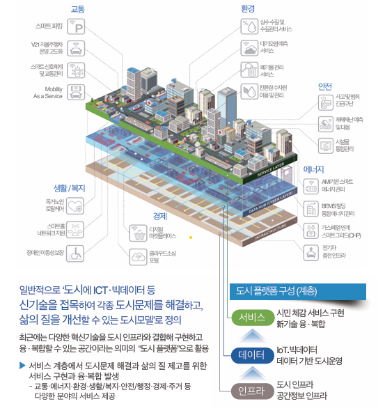 『스마트도시 조성 및 산업진흥 등에 관한 법률』제2조“스마트도시”란 도시의 경쟁력과 삶의 질 향상을 위하여 스마트도시기술을 활용하여 건설된 스마트도시기반시설 등을 통하여 언제 어디서나 스마트도시서비스를 제공하는 도시를 말한다.